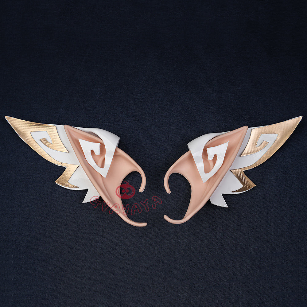 Package Include: Dress *1,Sleeves *1,Train (of the dress) *1,Leg accessory *1,Stockings *1,Hat *1,Hair accessory (bow) *3,Elf ear model *1,Elf ears *1,Divine Eye *1