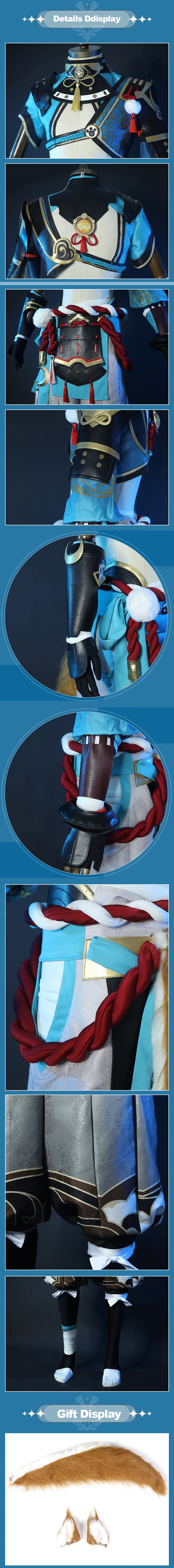 - Package: Top*1, Pants*1, Head Accessories*1, Waist Accessories*1, Left Shoulder Ornament*1, Gloves*2, Belt*1, Body Piece*1, Chest Piece*1, Bracer*1, Shoulder Armor*1, Armband*1, Geo Vision*1, Bandage*2, Socks*2, Tail*1, Hair Accessories*2