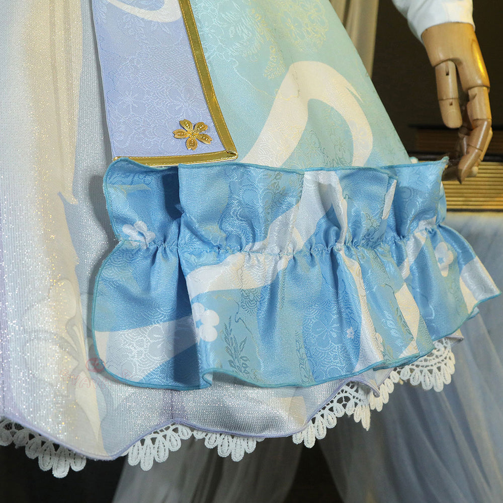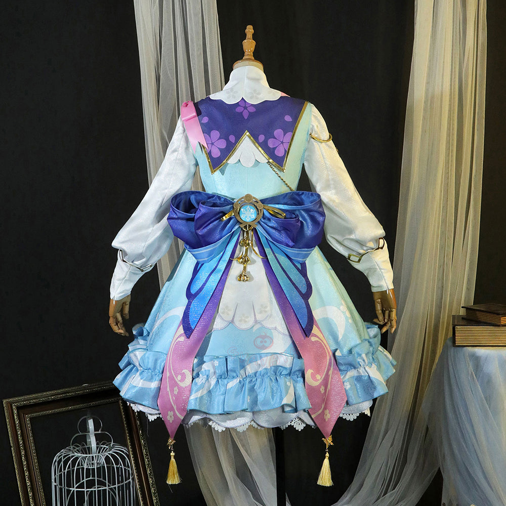 Package Include: Dress*1, Collar*1, Neckwear*1, Back waist bow decor*1, Coat*1, Tights*1, Wrist brace*2, Cyro vision prop*1, Leg ornaments*2, Hat*1, Ring accessory*1, Hair accessories*12